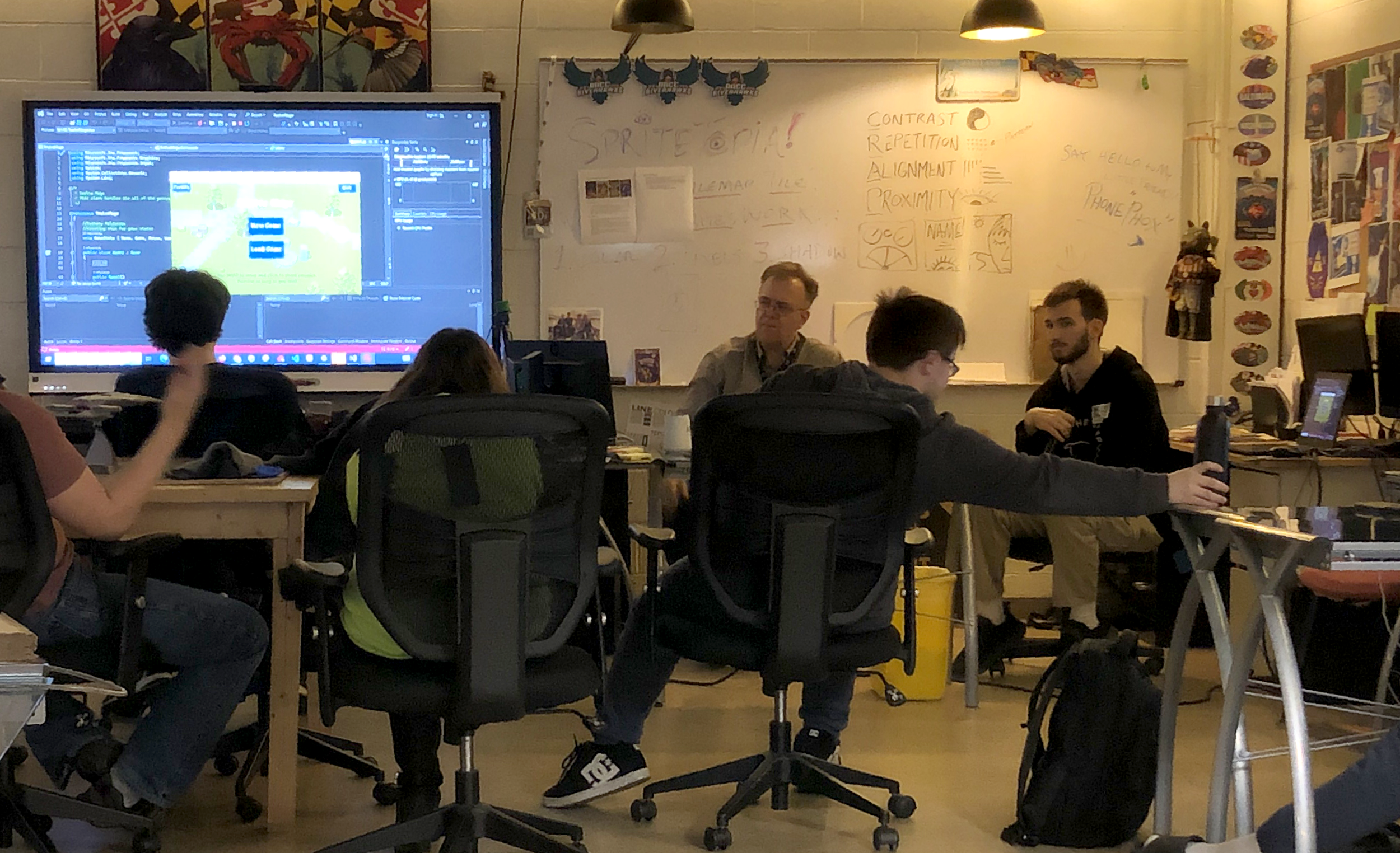 Ben Fawley (pictured far right) explaining the coding assignment of the game (shown on screen) that he and his fellow classmates created at RIT.edu